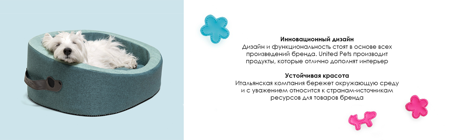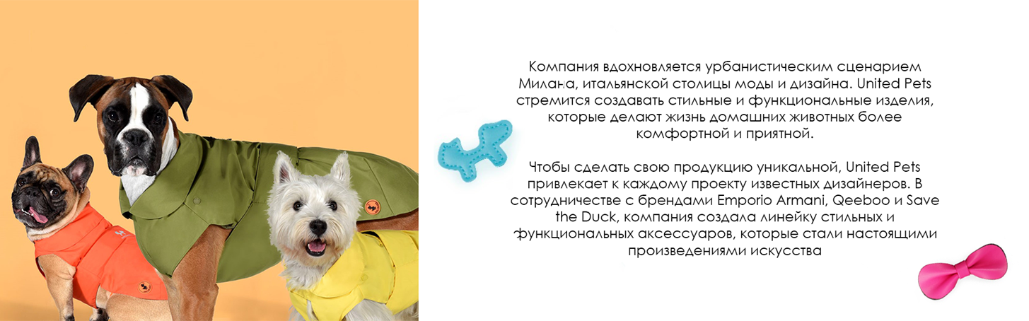 Все продукты United Pets создаются любителями животных и настоящими энтузиастами дизайна. За каждым новым аксессуаром United Pets стоит труд итальянских дизайнеров и бескомпромиссное желание делать лучшее для наших питомцев и для нас. В сотрудничестве с брендами Emporio Armani, Qeeboo и Save the Duck бренд United Pets создала линейку стильных и функциональных аксессуаров, которые стали настоящими произведениями искусства.